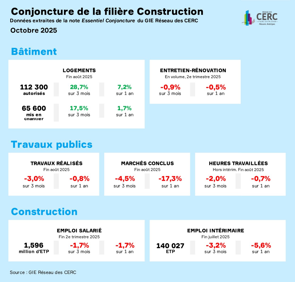 Dans sa note d’octobre 2025 sur la conjoncture de la filière construction, le réseau des CERC décèle quelques signaux de reprise dans la construction neuve mais la situation reste contrastée dans les travaux publics et orientée défavorablement sur le front de l’emploi salarié et des défaillances d’entreprises.